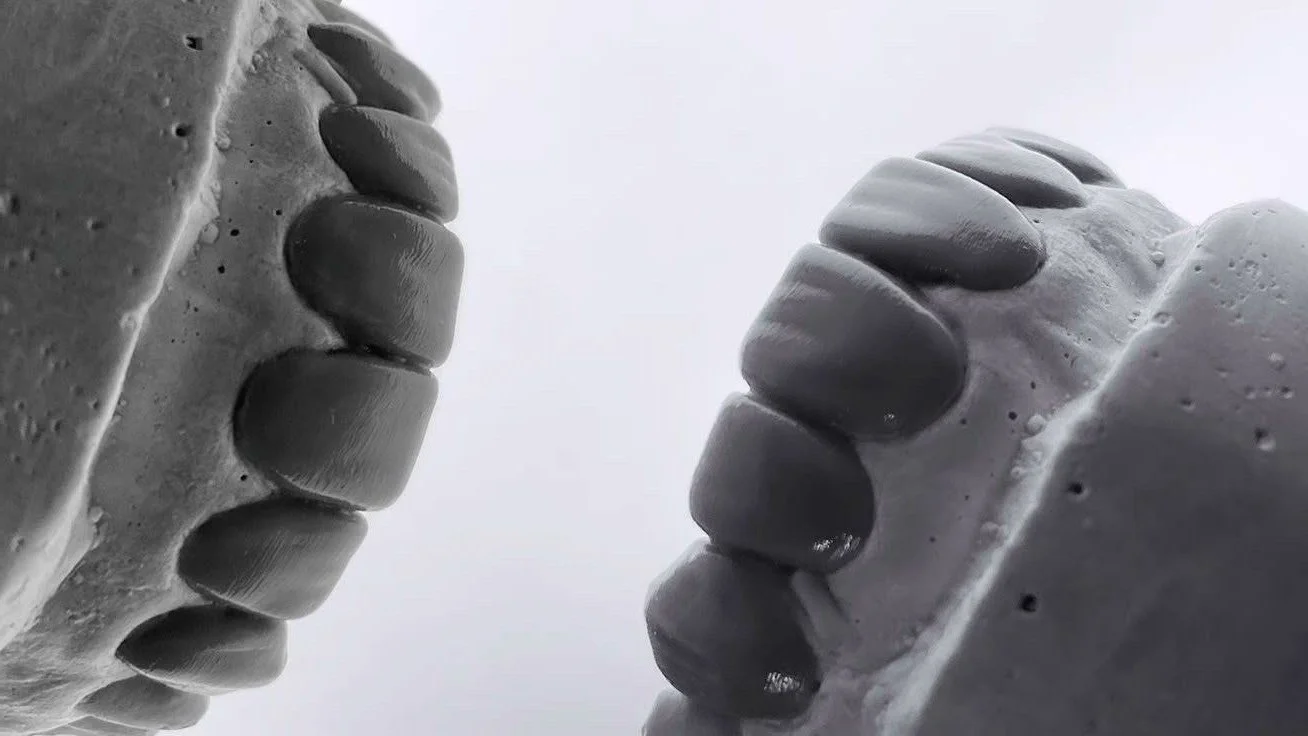 A hand wearing a black glove holding a dental mold of teeth against a black background.